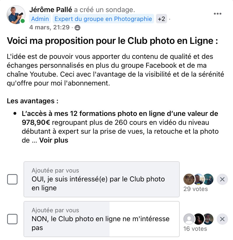 Je travaille actuellement à la mise en place sur mon site web du Club photo en ligne dont nous avons récemment parlé dans le groupe Facebook. L’idée c’est de continuer les exercices photo sur la chaine Youtube et dans le groupe Facebook. Mais d’aller encore plus loin en te permettant d’accéder avec un abonnement à tous mes cours en ligne et à un coaching en visioconférence chaque semaine pour répondre à tes questions. Et bien plus encore !