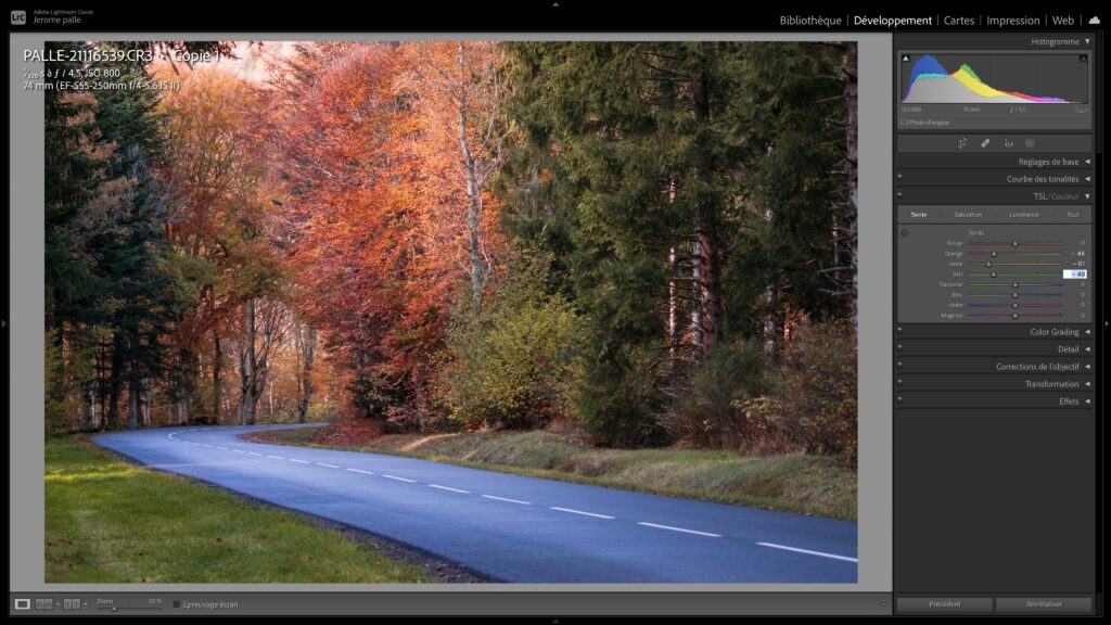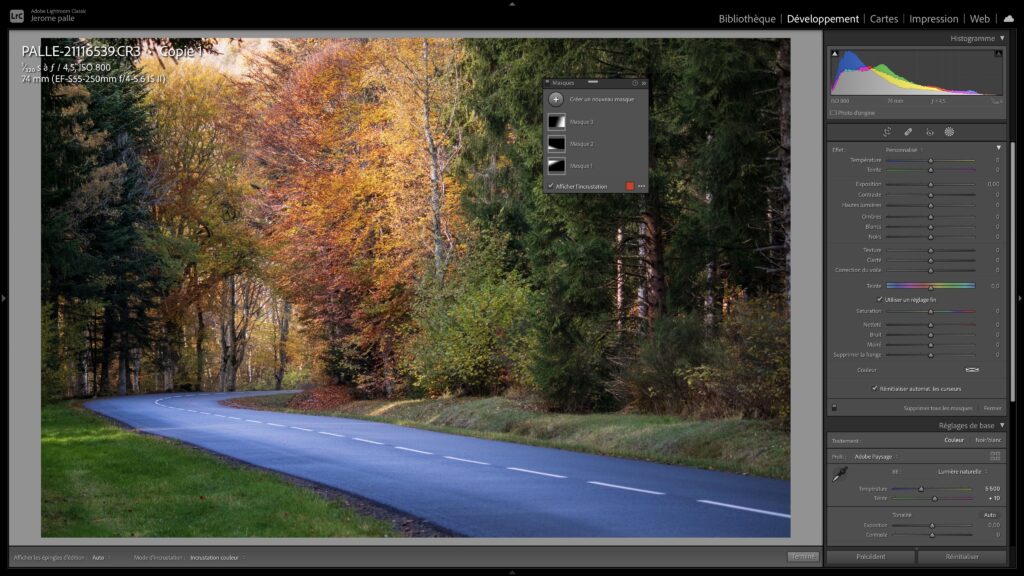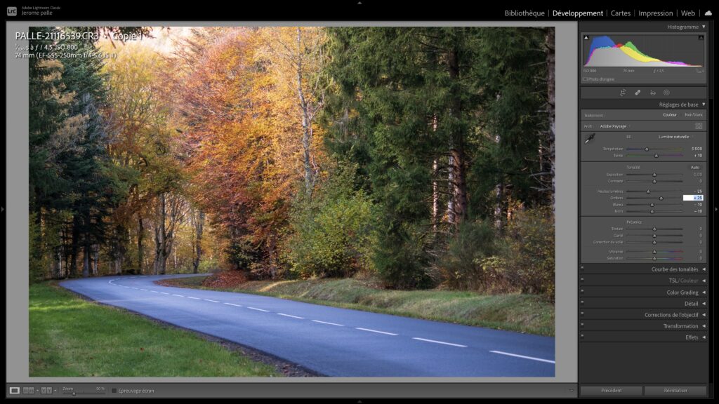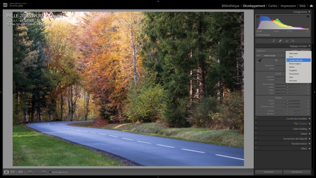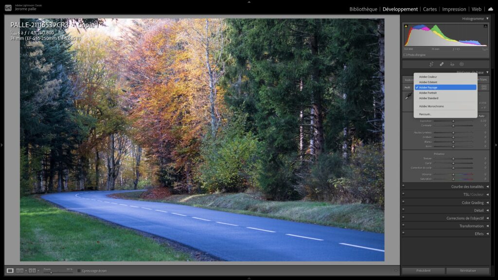 Sans dévoiler toutes les astuces de Scott Kelby, je te propose de suivre la trame de sa méthode en l’appliquant à une photo de paysage d’automne.
