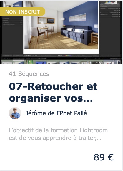 Et enfin, toujours sur Lightroom : Retoucher et organiser vos images avec Lightroom, la formation en ligne à retrouver sur mon site pour créer ta photothèque avec Lightroom, comprendre et utiliser les outils de base et avancés et optimiser ton flux de production.