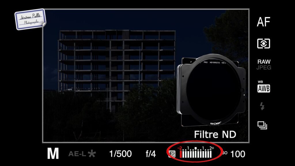 Ici, pas de difficulté particulière. On est pas dans la configuration d’une sous-exposition sur l’ensemble de l’image comme avec le filtre ND. Donc tu peux photographier en utilisant le programme d’exposition que tu veux mais en sous-exposant comme on l’a vu dans la vidéo de la semaine dernière sur le principe de la nuit américaine.